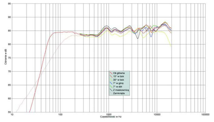 Maskownica wtrąca dwie wąskopasmowe zapadłości przy 4 i 7,5 kHz. Efektywność to przyzwoite dla małego monitora 85 dB.