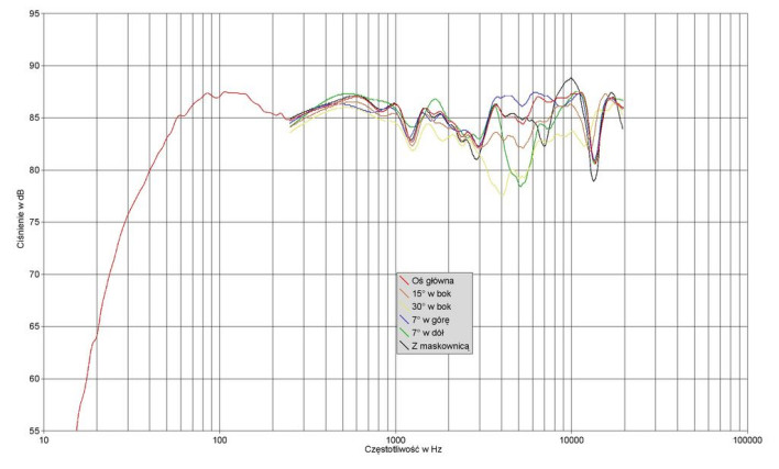 Ustawienie się zbyt nisko (-7°), czyli użycie zbyt wysokich podstawek lub zbyt niskiego fotela odsłuchowego, przy małej odległości spowoduje wąskopasmową, ale wyraźną zapadłość przy 5 kHz. Na osi 30° (w bok) osłabienie jest szersze, rozpoczyna się już przy 3 kHz. Z kolei na osi 7° w górę zakres 4 - 10 kHz ma najwyższy możliwy poziom, którego lekkie obniżenie na naszej osi głównej wydaje się nawet najodpowiedniejsze. Maskownica wprowadza tylko lekkie perturbacje - lokalnie osłabia 7 kHz i wzmacnia 10 kHz. Prawdopodobnie skutkiem działania nietypowej osłony tweetera (odbicia) jest wąskopasmowe osłabienie w najwyższej oktawie. Bardzo podobne efekty widzieliśmy w pomiarach Soavo 1.