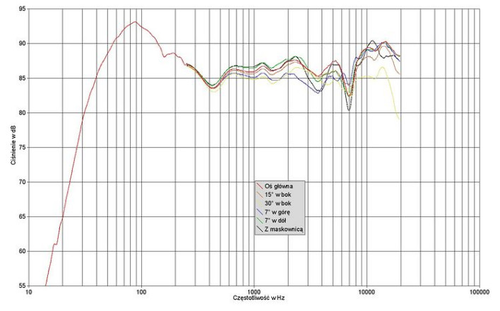 Lekko wyeksponowana jest najwyższa oktawa, od czego można jednak uciec na osi 30o, również bas jest spory i dobrze rozciągnięty, spadek -6 dB względem poziomu średniego mamy przy 35 Hz. A ten średni poziom, służący do wyznaczenia efektywności, to dobre 87 dB. Producent podaje 92 dB...