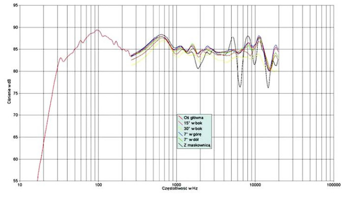 Dopiero charakterystyka z osi 30° w płaszczyźnie poziomej leży już wyraźnie niżej, widać też silny wpływ maskownicy, wywołującej szereg "zębów", nie tylko w zakresie wysokotonowym, ale również średniotonowym.