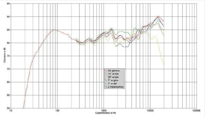 Laboratorium Pofalowanie w zakresie niskośredniotonowym, wzmocnione wysokie. Umiarkowana efektywność 84 dB, ale obciążenie bardzo łatwe - 8 omowe.