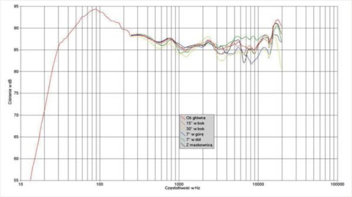 Charakterystyka przetwarzania jest łatwa do opisania - wzmocniony i dobrze rozciągnięty bas (spadek - 6dB względem poziomu średniego nawet poniżej 30 Hz, a względem szczytu przy 100 Hz w okolicach 40 Hz). Powyżej chwali się dobre wyrównanie średnich częstotliwości, ale wysokie tony (bez samego skraju) są lekko osłabione na osi głównej i jeszcze bardziej pod kątem +7O (w płaszczyźnie pionowej), najlepiej dopasowują się do średnicy pod kątem -7O (dla osiągnięcia takiego rezultatu w praktyce należy więc usiąść dość nisko). Widoczne rozejście się charakterystyk w tym zakresie to niekorzystny efekt uboczny stosowania pary tweeterów, za to rozpraszanie na skraju pasma jest bardzo dobre. Co ma większy wpływ na brzmienie?... Wpływ maskownicy jest już niewielki.