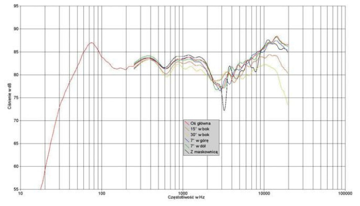 Wszystkie krzywe tworzą w tym zakresie dość ścisłą wiązkę, wynika to z zastosowania filtrów wyższego rzędu. Osłabienie w najwyższej oktawie, wyraźne już pod kątem 15O, a tym bardziej 30O w płaszczyźnie poziomej, można wykorzystać, szukając optymalnego ustawienia kolumn ? ominięcie z osią główną miejsca odsłuchowego pozwoli zmniejszyć udział wysokich tonów. Maskownica wprowadza wąskie osłabienie nieco powyżej 2 kHz i kilka jeszcze mniejszych nierównomierności powyżej.