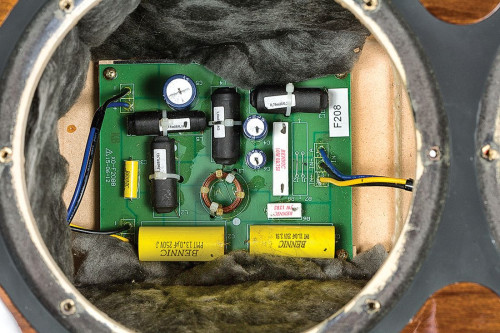 Zwrotnicę podzielono między dwie płytki. Na jednej (lewa) umieszczono filtr sekcji niskotonowej. Jak widać - dość skomplikowanej, skoro znajdują się w niej aż trzy cewki (rdzeniowe), dwa kondensatory (elektrolityczne) i jeden rezystor (ceramiczny). Podręcznikowy dolnoprzepustowy filtr 3. rzędu zawiera dwie cewki i kondensator. Prawdopodobnie taki filtr uzupełniono równoległym obwodem RLC, częściowo linearyzującym impedancję (w zakresie "górnego" wierzchołka bas-refleksowego, przy 40 Hz, na co wskazują pomiary - jest wyraźnie spłaszczony). Zastanawiające jest jednak wyprowadzenie kabli do obydwu niskotonowych z oddalonych miejsc (po lewej stronie płytki) - a przecież są podłączone do tego samego filtra. Ponadto kabel doprowadzający sygnał do filtra (po prawej stronie płytki) jest tylko dwużyłowy, więc regulacja poziomu jest prowadzona poza tą płytką.