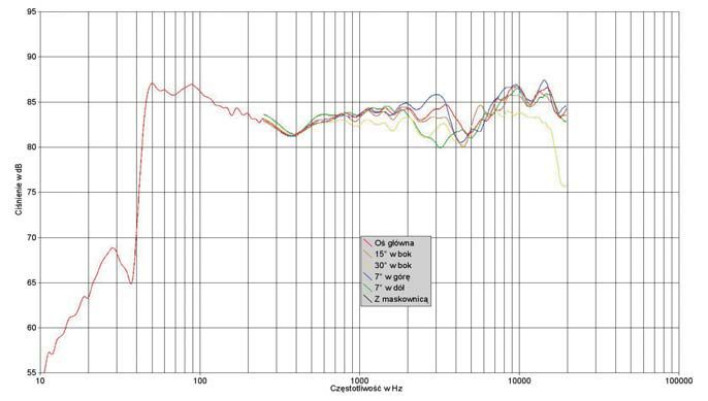 W zakresie średniowysokotonowym widać dużą zmienność przy kilku kHz, czyli w okolicach częstotliwości podziału, na skutek niestałych relacji fazowych między głośnikami nisko-średniotonowym a wysokotonowym przy zmianie kąta pomiaru - zwłaszcza w płaszczyźnie pionowej.