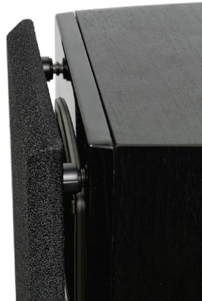 Zaciekawił mnie sposób połączenia ścianki tylnej z pozostałymi - wykonany jest "na ostro", bez żadnego widocznego z zewnątrz wpustu, dylatacji itp, takiego łączenia trzech ścianek (narożniki), z powodów technologicznych i kosztowych, nie widuje się przy wykończeniu folią, to raczej rozwiązanie typowe dla obudów wykończonych naturalnym fornirem (dla porównania proszę popatrzeć na zdjęcia fragmentów tylnych ścianek wszystkich testowanych kolumn - tylko Yamaha NS-F330 może pochwalić się takim wykonaniem).
