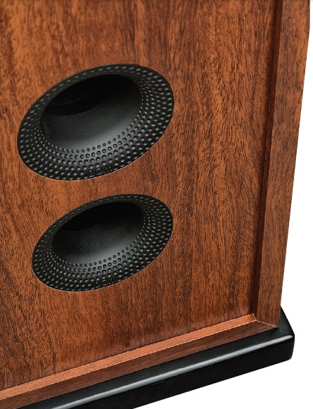 Z jednej, wspólnej komory obydwu głośników niskotonowych wyprowadzono dwa tunele, ale parametry takiego układu rezonansowego nie różnią się od klasycznej sytuacji z jednym tunelem (o powierzchni będącej sumą mniejszych tuneli); na wyprofi lowanych wylotach widać dodatkowe "nakrapianie", redukujące szumy turbulencyjne.