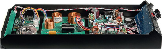 "Szuflada" z elektroniką; w pobliżu gniazd dwie płytki z końcówkami mocy, bezpośrednio przy nich płytka dedykowana regulacjom, na drugim skraju wspólny zasilacz, a pośrodku - płytka z elementami biernymi, a więc filtry kształtujące charakterystykę elektrostatu.
