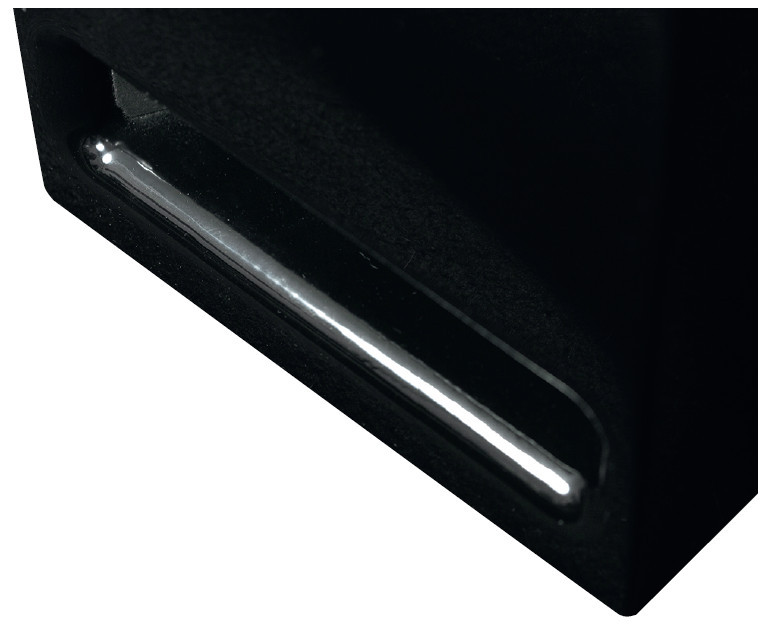 Szczelina na dole tylnej ścianki Subwoofera to wylot bas-refleksu, którego tunel ma jednak nietypowy przekrój; w głównej części jest on znacznie mniejszy (węższy), niż w wylocie, co było konieczne do ustalenia niskiej częstotliwości rezonansowej.