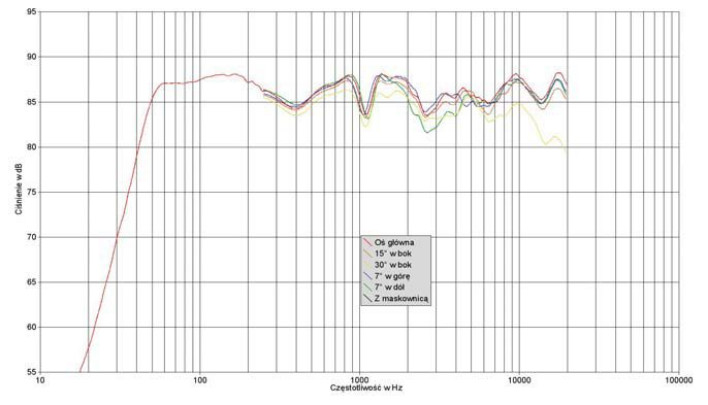 Charakterystyka przetwarzania nie jest idealnie wygładzona, jednak utrzymuje się w ścieżce +/-2,5 dB w bardzo szerokim pasmie, już od 45 Hz, i to nie tylko na osi głównej, co można podsumować jednym zdaniem, HM2 są bardzo dobrze zrównoważone. Ani niskie, ani wysokie tony nie zostały choćby odrobinę wyeksponowane, ale dobre rozpraszanie górnego zakresu powinno zapewnić jego optymalną aktywność. Bas jest z kolei ładnie rozciągnięty, spadek -6 dB względem średniego poziomu pojawia się przy ok. 40 Hz.