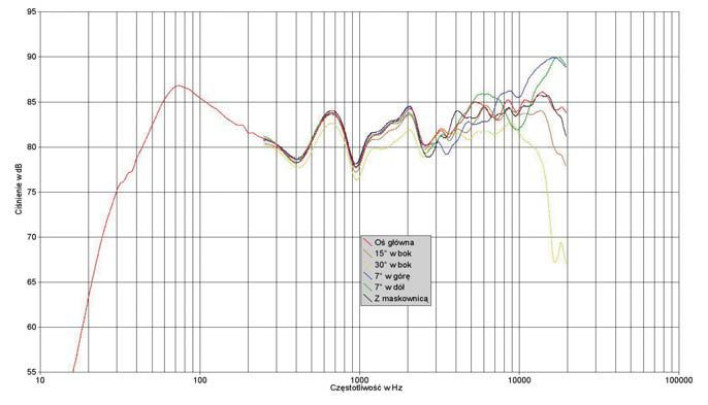 Charakterystyka przetwarzania nie wzbudzi entuzjazmu inżynierów, ale mimo wielu nierównomierności jej ogólny kształt wygląda dość "fizjologicznie". Ciekawostką jest, że uwypuklenie w najwyższej oktawie pojawia się pod kątem 7 st. poniżej i powyżej osi głównej, a na niej poziom jest relatywnie najniższy. Ta szczególna sytuacja (na tyle dziwna, że przeprowadziliśmy w tej sprawie śledztwo i ponowne pomiary!) wynika chyba z efektu wygaszania się promieniowania od kopułki (mimo jej dolnoprzepustowego filtrowania) i wstążki w tym zakresie. Inaczej trudno to wytłumaczyć. Już spodziewane dalej idące wygaszenie góry powoduje zejście na oś 15O, a tym bardziej 30O w płaszczyźnie poziomej.