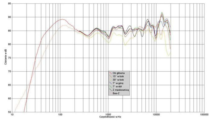 Szereg drobnych nierównomierności wprowadza też maskownica, ale radykalnie nie psują one obrazu. Ogólniejsza tendencja charakterystyki to lekkie wznoszenie ku wysokim częstotliwościom, z równoczesnym wyeksponowaniem niskich tonów (w przypadku pracy bas-refleksu); wówczas spadek -6 dB mamy poniżej 40 Hz. Zamknięcie otworu, zgodnie z oczekiwaniami, skutkuje znacznie wcześniejszym, choć łagodniejszym spadkiem charakterystyk.