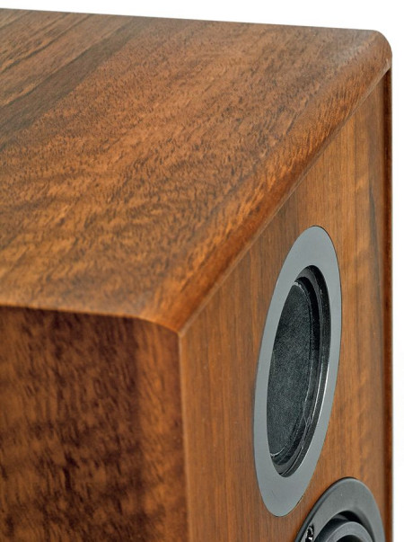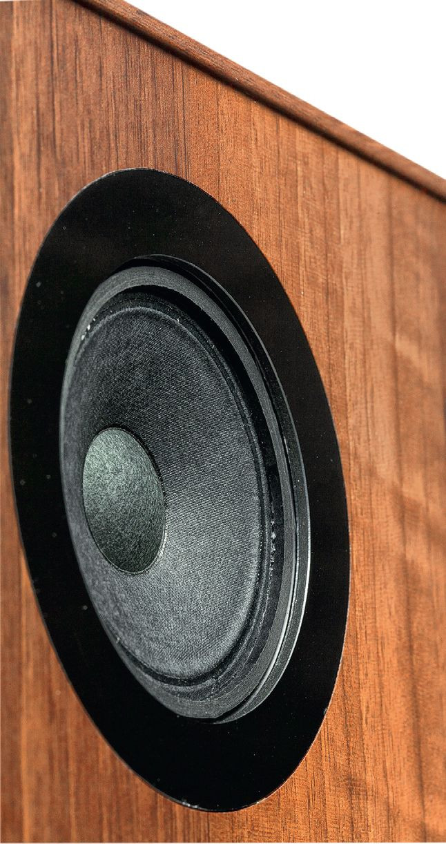 Z bliska łatwo jednak dostrzeżemy nietypowy głośnik wysokotonowy - zamiast powszechnej dzisiaj kopułki pojawia się "papierzak", przetwornik z 50-mm, celulozową membraną stożkową, zawieszoną na płytkiej "fałdzie", i malutką kopułkową nakładką przeciwpyłową w centrum, o średnicy odpowiadającej 14-mm cewce.