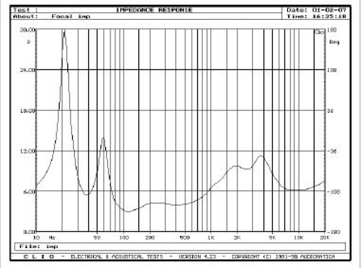 Z katalogu dowiemy się, że impedancja nominalna to 8 omów, a minimalna - 2,9 oma. Spójrzmy na rys. 1., a na pewno potwierdzimy to drugie - 2,9 oma widzimy przy ok. 100Hz. Ale w takim razie, raczej zdecydowalibyśmy się określić impedancję znamionową jako 4-omową.
