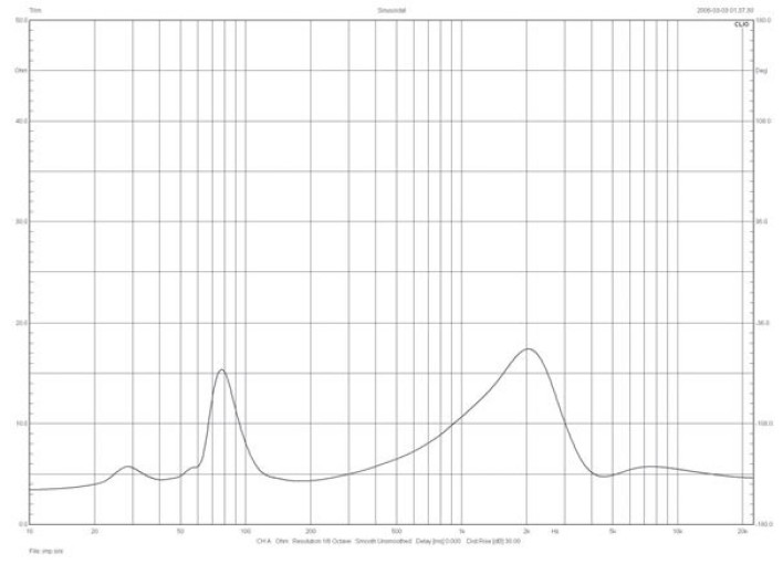 Ponownie zaczynamy od impedancji, chociaż dopiero teraz, po raz pierwszy w tym teście, mamy do czynienia z impedancją znamionową 4 Ω i deklaracją producenta, że parametr ten ma wartość... 4 Ω. Czyli tak, jak powinno być, a jak zwykle nie jest. Minimum (na charakterystyce modułu impedancji) w newralgicznym zakresie kilkuset herców ma wartość nawet nieco wyższą od 4 Ω.
