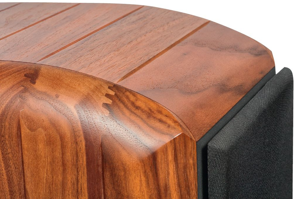 Z klepek litego drewna wykonano więc częściowo ścianki boczne i górną, natomiast front, tył i wewnętrzne wzmocnienia przygotowano z HDF-u. Jest ich bardzo wiele, zwłaszcza w sekcji subniskotonowej, gdzie do wytłumienia jest duża energia; w pozostałej części pełnią one równocześnie funkcję przegród tworzących niezależne komory głośników pracujących w różnych podzakresach.
