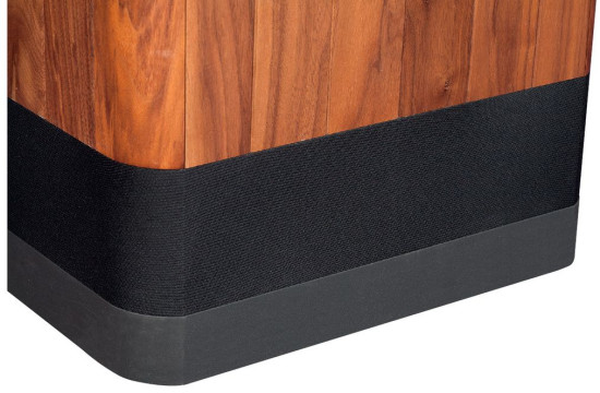 Tak dyskretnie, jak to tylko możliwe, przez obleczony materiałem cokół wydostaje się ciśnienie z głośników subniskotonowych i ich bas-refleksu.