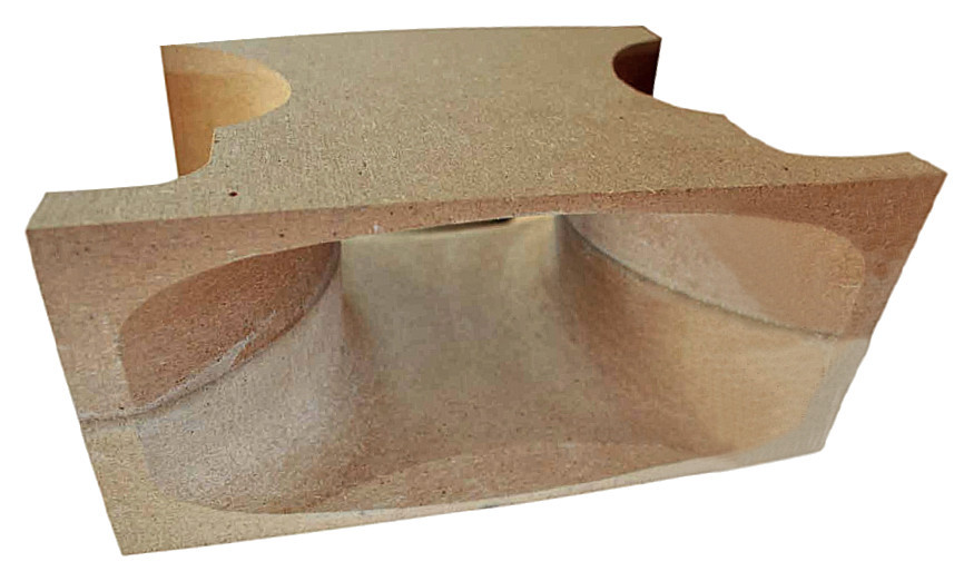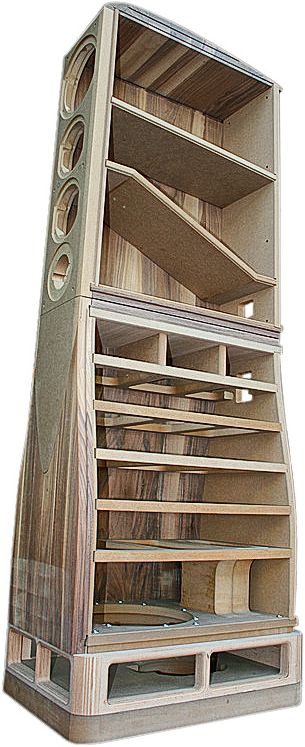 Obudowa składa się z dwóch zasadniczych części: dolnej subniskotonowej (wewnątrz wzmocnionej wieloma poziomymi "wieńcami") i górnej dla pozostałych sekcji (podzielonej na trzy komory; od góry: dla głośnika niskotonowego, głośnika "dolnego środka" i głośnika średniotonowego). Widać zastosowanie zarówno elementów litego drewna, jak i płyt HDF. Głośniki subniskotonowe, skręcone ze sobą, są mocowane od dołu do dolnej ścianki, przed zainstalowaniem cokołu. Za otworem głośników widać pionowo zorientowany tunel bas-refleksu ("klepsydrę").