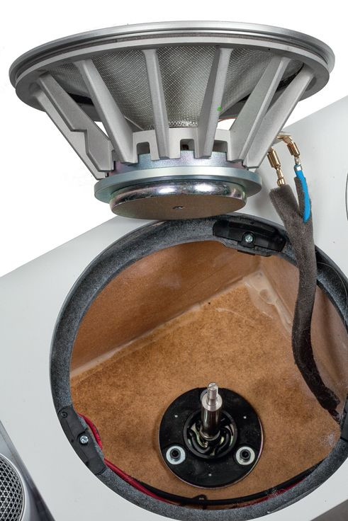 Obudowa głośnika wysokotonowego też jest mocowana elastycznie – przykręcana za pośrednictwem elementu tłumiącego drgania. W 702 S2 jest więc sporo solidnego "osprzętu": śrub, nakrętek, podkładek, resorów... To nie są "zwykłe" obudowy z mdf-u, do których wkręcono zwrotnice i głośniki; wokół każdego głośnika "dużo się dzieje", techniczna wartość jest bardzo wysoka, chociaż aby ją w pełni docenić, trzeba kolumny rozkręcić, a w tym przypadku to też nie jest łatwe...