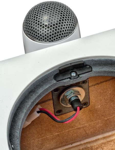 Łeb śruby z tyłu obudowy wysokotonowego sugeruje, że tą drogą można przeprowadzić demontaż jego zasadniczych elementów (np. na wypadek przeciążenia); nawet profi l tego łba dopasowano do profi lu obudowy... albo odwrotnie - w każdym razie wszystkie detale są dopieszczone. Widać, że "podpórka" obudowy odsuwa ją na kilka milimetrów od powierzchni przedniej ścianki; podpórka nie jest sztywna, ale sztywna jest już sama obudowa wycięta z aluminiowego bloku.