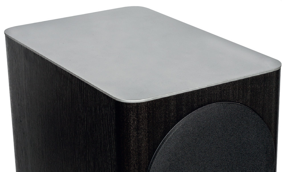 Górna ścianka jest przykryta grubą płytą aluminium, co może mieć nie tylko znaczenie estetyczne, ale i akustyczne (wibracje skrajnych ścianek, górnej i dolnej, są potencjalnie największe). Podobną płytę przykręcamy do dolnej ścianki, jest ona cokołem, w którym tylne kolce są rozstawione szerzej niż przednie, poza obrysem obudowy (co tłumaczy, dlaczego ten element montujemy samodzielnie; gdyby był zamontowany fabrycznie, opakowanie musiałoby być znacznie większe).