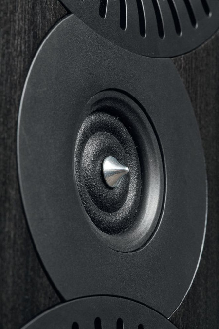 Podobne rozwiązanie stosuje, właśnie w tym celu, kilku producentów, m.in. KEF. Razem z pierścieniem głośnik ma całkowitą średnicę 18 cm, a sama membrana – 12,5 cm. Producent podaje, że to 15-ka, co może się odnosić do średnicy membrany razem z zawieszeniem. Analogiczne głośniki nisko-średniotonowe, w dwóch wariantach wielkości (mniejszy to według producenta 13-ka, a naszym zdaniem – 15-ka) są stosowane we wszystkich modelach serii QX.