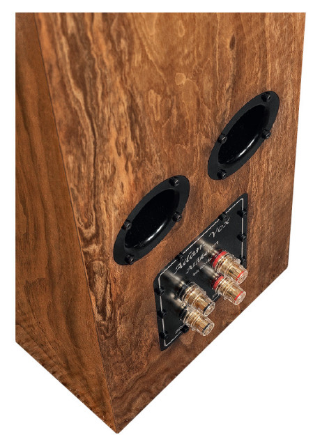 Dwa tunele bas-refleks, wyprowadzone ze wspólnej komory obydwu nisko-średniotonowych, solidnie przykręcono, ale nie są one największą ozdobą tej konstrukcji.