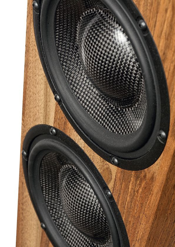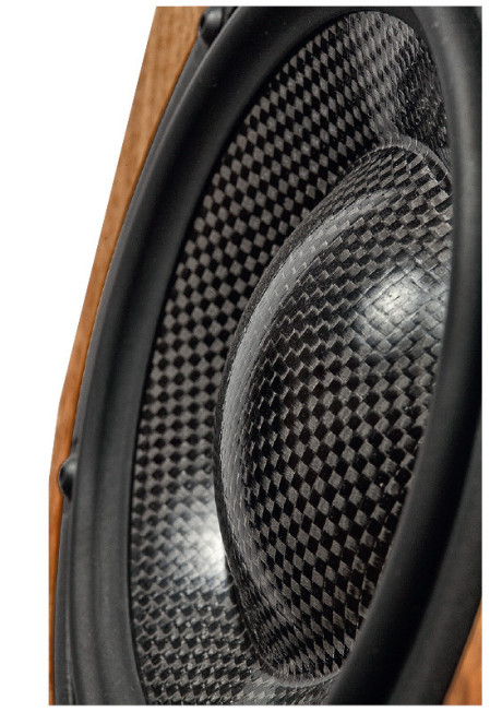 Z "naturalną" obudową kontrastują membrany głośników nisko-średniotowych - "sandwicze" z widoczną plecionką z włókna węglowego.