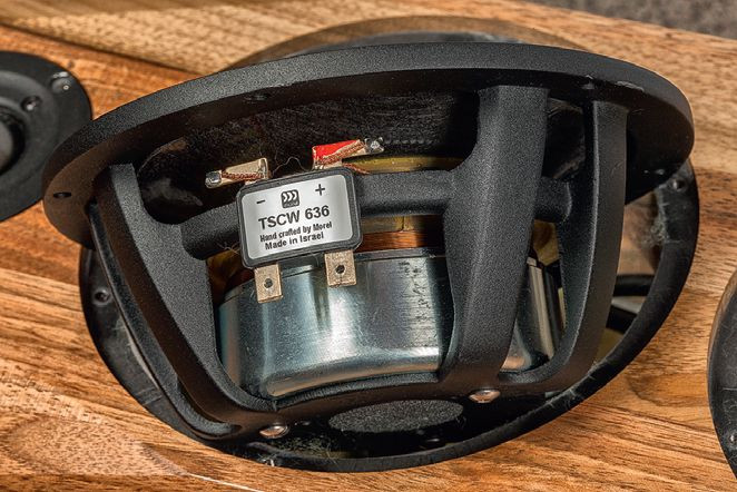 16-ki Morela, w tym jedna z najlepszych - TSCW 636 - mają kosze odlewane, z ramionami obejmującymi cały układ magnetyczny, podobnie jak w głośnikach Dynaudio. Taką architekturę dyktuje bardzo duża cewka i przeniesienie magnesów do środka układu. Te magnesy nie zawsze są bardzo silne (bo w obrębie 75-mm cewki nie zmieszczą się duże), ale w TSCW 636 do standardowego pierścienia ferrytowego dodano neodymowy.