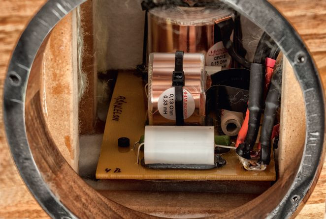Układ głośnikowy jest bardzo prosty - dwudrożny. Wygląda na dwuipółdrożny, ale o jego prawdziwym charakterze decyduje sposób filtrowania, a obydwie 16-ki są podłączone przez ten sam filtr i pracują jako nisko-średniotonowe. Mimo to zwrotnica jest skomplikowana, co nie wszyscy uwielbiają, ale zostawmy już te decyzje konstruktorowi i rozliczmy go dopiero z końcowych rezultatów.