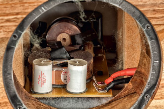 Jeszcze bardziej imponująco wygląda filtr wysokotonowego. Główną rolę odgrywają w nim kondensatory Supreme Evo (w głębi – czarne elementy ustawione pionowo), ale intrygująca jest obecność bardzo dużej cewki (niezależnie od mniejszej, która jest prawdopodobnie podstawową w filtrze 2. lub 3 rzędu). Wszystkie cewki i kondensatory kupiono od Mundorfa.