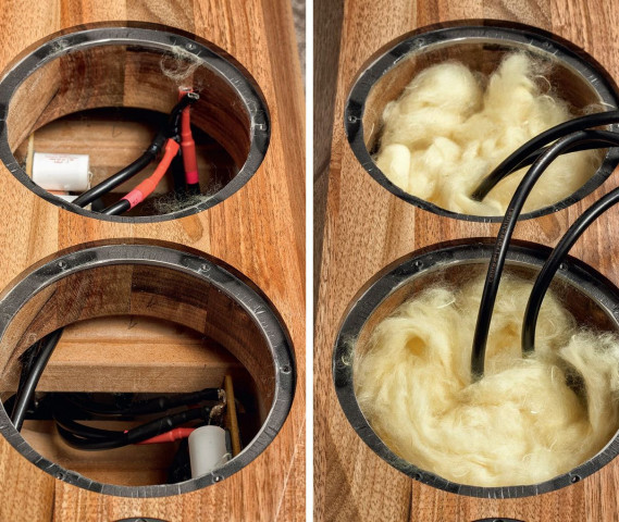 L: Obudowa jest pancerna, i to na wzór czołgów - najgrubszy jest pancerz czołowy. Można oszacować, że masa samego frontu to połowa masy całej obudowy, w pozostałej części wykonanej z 25-mm MDF-u – też dobrze; P: Cała przestrzeń jest wypełniona luźnym włóknem z Twaronu ("Angel Hair"). Dobrze sprawdza się w obudowach bas-refleks, nie tłumiąc podstawowego rezonansu.