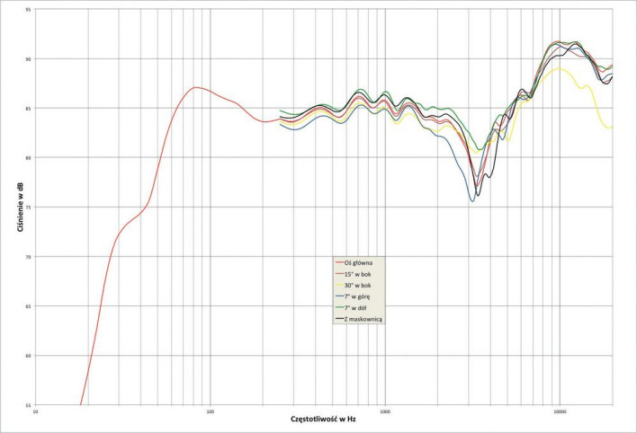 Sam producent też nie obiecuje bardzo niskiej częstotliwości granicznej, podając pasmo 45 Hz – 20 kHz (ale bez tolerancji decybelowej). Charakterystyka biegnie ładnie (w wąskiej ścieżce +/-1,5 dB) przez cały zakres średnich częstotliwości, do 2,5 kHz, powyżej pojawia się osłabienie, które koncentruje się przy 3,5 kHz i jego głębokość, jak zwykle w tym zakresie, jest zależna od osi pomiaru; najmniejsza pod kątem -7º w dół, największa (w zestawie naszych pomiarów) – pod kątem +7° w górę.