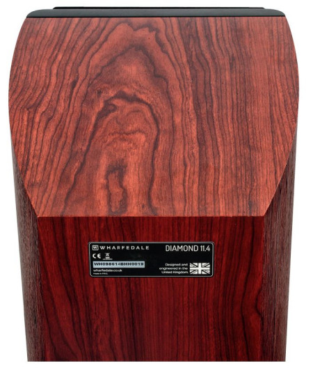 Boczne ścianki Wharfedale Diamond 11.4 są wygięte, najpierw lekko poszerzają obudowę (front ma 21,5 cm, a maksymalna szerokość - 22 cm), a dalej zbiegają się ku tyłowi - tylna ścianka ma już tylko 14,5 cm. Front jest polakierowany na wysoki połysk, pozostałe powierzchnie zostały oklejone folią drewnopodobną. Maskownica trzymana jest przez ukryte magnesy.