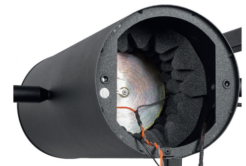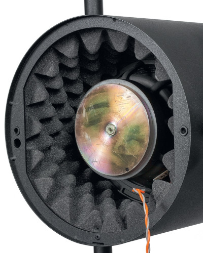 Głośnik nisko-średniotonowy, obserwowany od frontu, po wykręceniu tuby, ujawnia tylko środkową, wypukłą część membrany, widoczną przez 9,5-cm otwór, będący średnicą wlotu tuby.