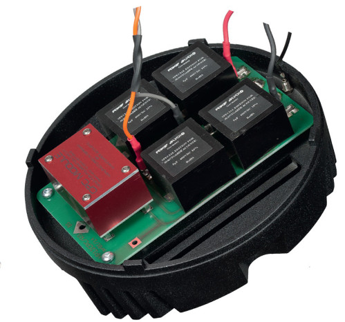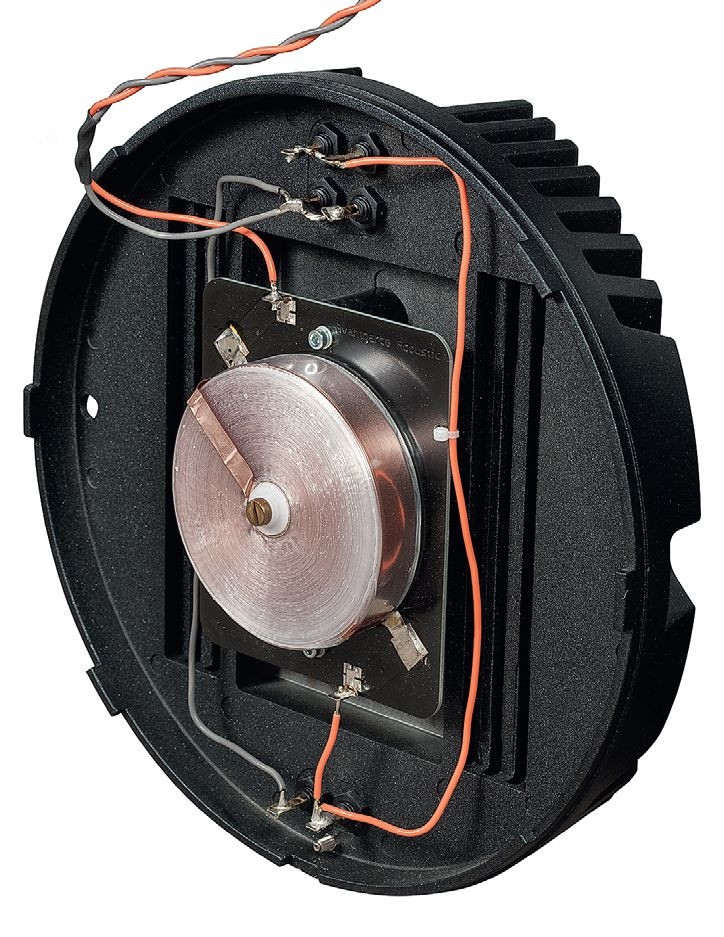 Bardzo duża (bo nawinięta szeroką taśmą) cewka dla nisko-średniotonowego pełni oczywiście rolę fi ltra dolnoprzepustowego. Kable biegnące dookoła prowadzą sygnał z gniazda wejściowego (na dole) do gniazd na górze, służących podłączeniu pozostałych przetworników.
