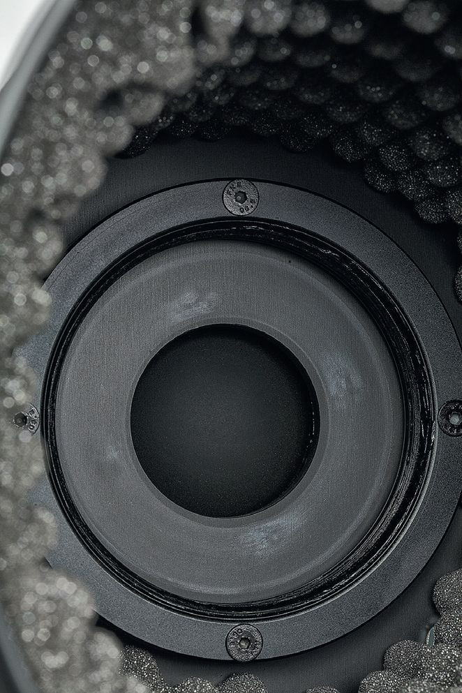 Również w głośniku nisko- -średniotonowym zawieszenie jest tekstylne; wielka nakładka przeciwpyłowa tylko przy okazji usztywnia membranę, a przede wszystkim służy ustaleniu właściwego czoła fali u wlotu tuby.