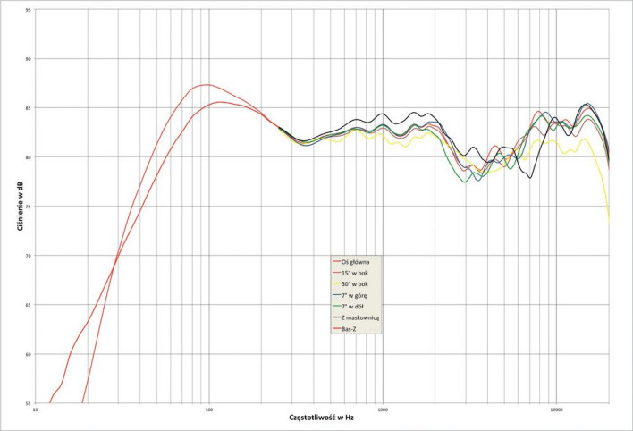 Pomimo wyraźnego obniżenia, charakterystyki zmierzone na różnych osiach trzymają się w tym zakresie blisko siebie (najbardziej "odstaje” charakterystyka z maskownicą), co wyklucza sytuację współdziałania głośników w szerokim zakresie, gdyż to spowodowałoby przesunięcia fazowe i wywołało lokalne osłabienia charakterystyki, o indywidualnym przebiegu dla poszczególnych osi.