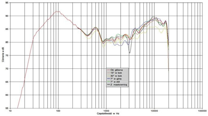 Wpływ maskownicy widać wyraźnie przy 3 kHz, ale jest to zjawisko wybitnie wąskopasmowe i nie zostanie wychwycone przez słuch. Jeżeli poszukamy spadku -6 dB (w zakresie niskich częstotliwości) względem średniego poziomu, to znajdziemy go nawet poniżej 30 Hz, chociaż w stosunku do wierzchołka przy 100 Hz punkt ten leży już o 12 dB niżej. Producent podaje pasmo 45 - 20 000 Hz z tolerancją +/- 3dB, ale jak już stwierdziliśmy, charakterystyka daleko wykracza poza tę ścieżkę. Katalogowa moc ciągła jest umiarkowana - 100 W, ale obydwa głośniki pracujące w zakresie niskich tonów mają cewki o średnicy 25 mm, więc faktycznie każdy z nich można szacować na ok. 50 W.