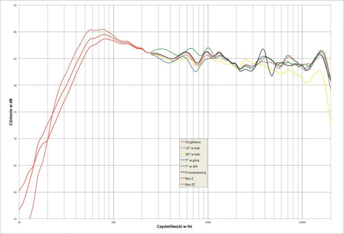 Taki rezultat dotyczy zarówno pomiaru na osi głównej, pod kątem 15º w płaszczyźnie poziomej, jak i pod kątami +/-7º w płaszczyźnie pionowej. Chociaż można dostrzec różnice między tymi dwoma ostatnimi krzywymi, to pozwalają one zmieścić się w takim polu, a - co ciekawe - są one największe w zakresie 500 Hz - 1 kHz, więc najprawdopodobniej wynikają one z przesunięć fazowych między sekcją niskotonową a średniotonową (częstotliwość podziału jest dość wysoka, producent podaje 650 Hz, lecz to nie dziwi przy zastosowaniu tak niewielkiego, a więc delikatnego średniotonowego), natomiast przejście przez podział między średniotonowym a wysokotonowym (wg danych producenta - 3 kHz) jest gładkie na wszystkich osiach.
