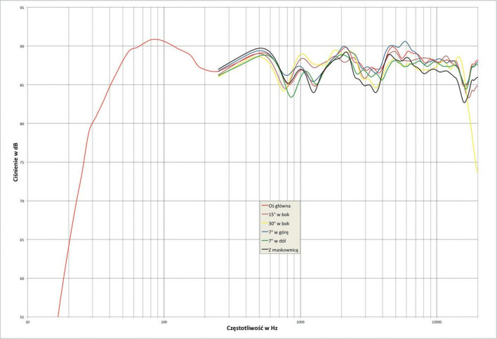 Na rysunku głównym jest pokazany jest typowy zestaw krzywych, z charakterystykami zmierzonymi pod kątami +/-7º w płaszczyźnie pionowej i 15º/30º w płaszczyźnie poziomej, z tym zastrzeżeniem, że przedstawia on sytuację, gdy schodzimy z osi głównej w kierunku krawędzi, bliżej której znajdują się przetworniki średniotonowy i wysokotonowy. Charakterystyki na osiach 15O/30O "skręconych" w drugą stronę pokazujemy na dodatkowym, małym rysunku (razem z tymi, które są na rysunku głównym), aby zwrócić uwagę na różnicę.