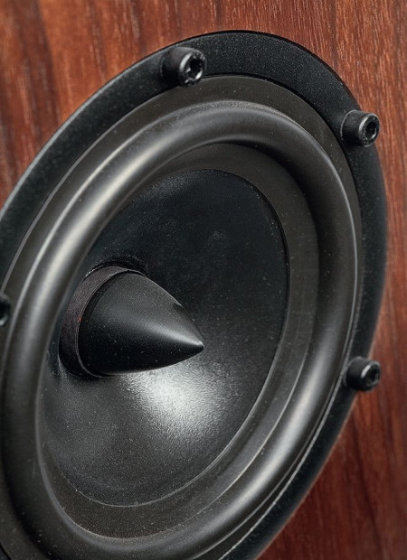 Jednak takie proste recepty nie zawsze działają, zawsze warto sprawdzić, czy konkretna konstrukcja dobrze znosi bliskość ściany, czy nie, bez względu na to, jaką ma obudowę. 15-cm głośnik nisko-średniotonowy ma membranę z polimeru (nowego typu E77) i typowy korektor fazy w kształcie pocisku.
