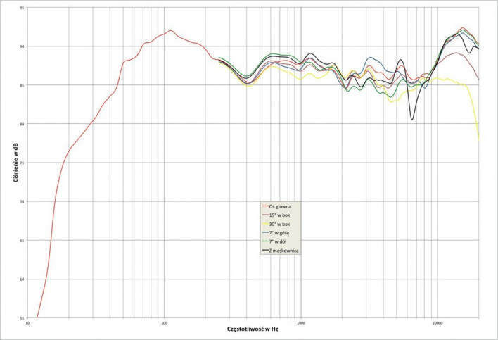 Tym razem najwyżej leży charakterystyka z osi +7°, bowiem z powodu wysokości kolumny właśnie ta oś naszego pomiaru zbliżyła się do osi głównej konstrukcji (wyprowadzonej pomiędzy średniotonowym a wysokotonowym), ale również na osi -7° nie powstają głębokie zapadłości, a lekkie obniżenie zakresu 3–5 kHz może uczynić średnie tony delikatniejszymi. Maskownica wprowadza dobrze widoczne, ale niekoniecznie mocno słyszalne, bo wąskopasmowe osłabienie przy 6,5 kHz.
