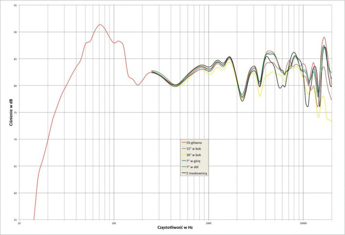 Mamy bardzo niewielkie zmiany charakterystyki w badanym zakresie kątów, nawet przy zastosowaniu łagodnych filtrów, ale nawet "wyjściowa" charakterystyka z osi głównej jest wyraźnie poszarpana. Nierównomierności pogłębia jeszcze maskownica, chociaż w tej sytuacji trudno przesądzić, czy jej wpływ na brzmienie będzie wyraźnie słyszalny.