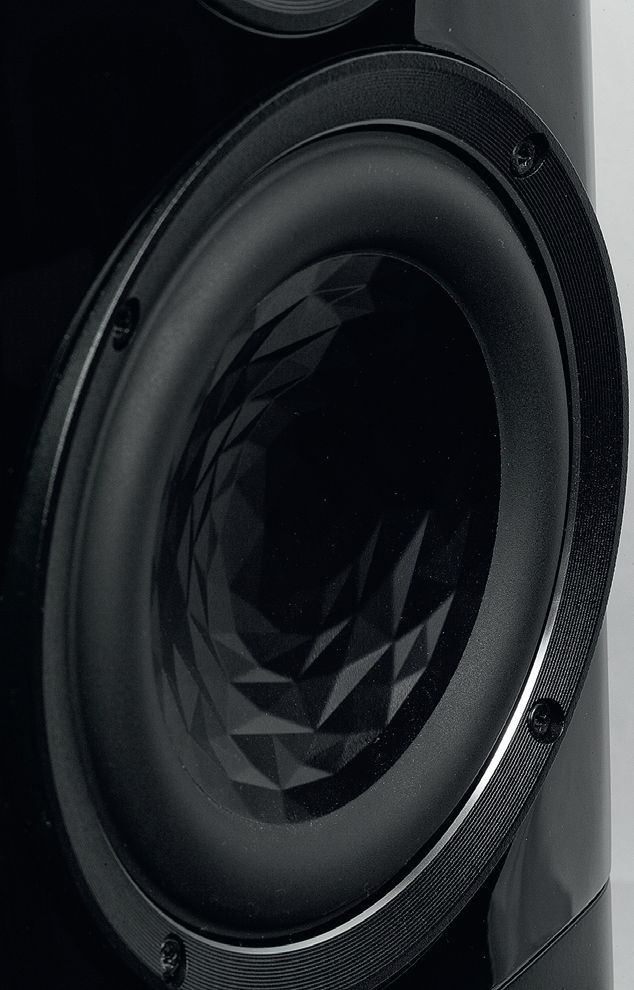 I znowu, tak jak w Monitor Audio, jest to membrana wielowarstwowa, z aluminiową warstwą zewnętrzną (widoczny "kryształ"), ale spodnia warstwa celulozowa nie jest połączona z "kryształem" na całej powierzchni, lecz tylko w strefie zewnętrznej (blisko zawieszenia), bowiem ta uformowana jest w stożek, w klasyczny sposób połączony z cewką (patrząc na membranę od tyłu, nie mamy pojęcia, jaki ma profil z przodu...).