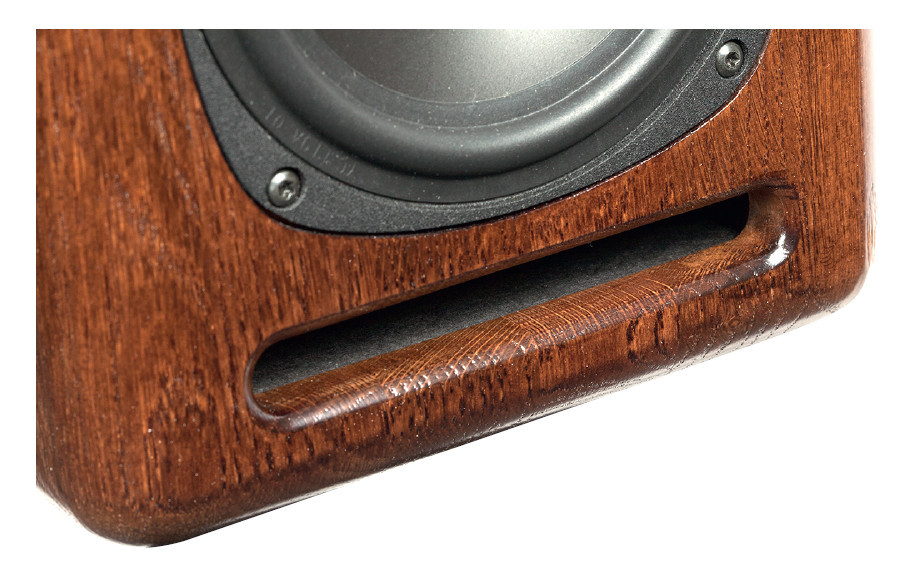 Zainteresowanych filtrami szeregowymi odsyłamy np. na www.tubecad.com oraz www.lcaudio.com. Wylot bas-refleksu przygotowano w formie szczeliny, która nie wiąże się z jakimś specyficznym działaniem i lepszymi charakterystykami, ale w tym przypadku pozwoliła na zmieszczenie otworu na niewielkiej przedniej ściance, co ma ułatwić ustawianie monitorków (nie można wykluczyć, że takie maleństwa "wylądują" np. na półce pod ścianą, a nie na standach).