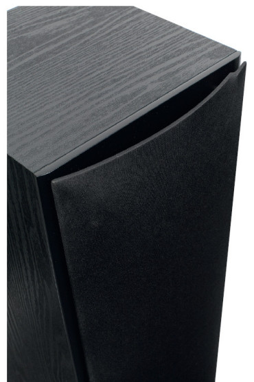Front polakierowano na czarno, pozostałe powierzchnie oklejono czarną folią imitującą rysunek drewna (black ash). Najładniejszym elementem designu jest właśnie maskownica - wygięta plastikowa ramka, którą chętnie pozostawiłbym założoną, jednak okazuje się ona mieć zbyt poważny (negatywny) wpływ na charakterystykę, aby to zignorować, więc jednak trzeba się będzie zakochać...