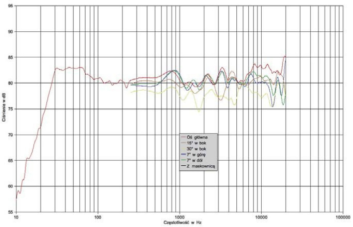 W naszym laboratorium wykonaliśmy tradycyjny zestaw pomiarów charakterystyki przetwarzania, dla różnych osi w płaszczyźnie poziomej i pionowej, z pominięciem wersji "z maskownicą", chociaż można uznać, że wszystkie charakterystyki dotyczą maskownicy założonej – tej, która jest na stałe założona na układ koncentryczny, bo na głośnikach niskotonowych nie ma żadnych maskownic.