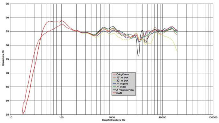 Przy niższym strojeniu charakterystyka w całym przetwarzanym pasmie mieści się w ścieżce +/-3 dB, prezentując przyjemny dla ucha kształt, z lekkim wycofaniem przełomu średnich i wysokich częstotliwości. Wyśmienicie przedstawia się zbieżność prawie wszystkich charakterystyk, mierzonych na różnych osiach, dopiero pod kątem 30O w płaszczyźnie poziomej widać większe pofalowania i osłabienie najwyższej oktawy, natomiast zmiana wysokości odsłuchu nie spowoduje praktycznie żadnych problemów. Głośnik wysokotonowy działa wyśmienicie, gładko dochodzi do 20 kHz. Nawet maskownica, wbrew pozorom, nie powoduje wielkich kłopotów - nierównomierności między 3 a 5 kHz są dobrze widoczne, bo głębokie, ale jednocześnie wąskopasmowe, więc dla ucha mniej wyraźne.