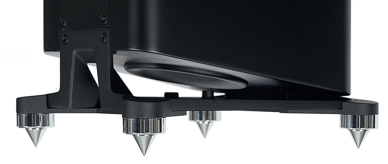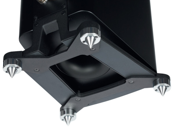 Dolna część obudowy (a właściwie dodatkowa konstrukcja, która się pod nią znajduje) jest dość skomplikowana. Złożony cokół ma tutaj do odegrania kilka ról: "wypionować" obudowę, której dolna ścianka nie jest ustawiona poziomo, zapewnić swobodne wypromieniowanie ciśnienia z bas-refleksu i oczywiście szeroko rozstawić punkty podparcia (kolce).